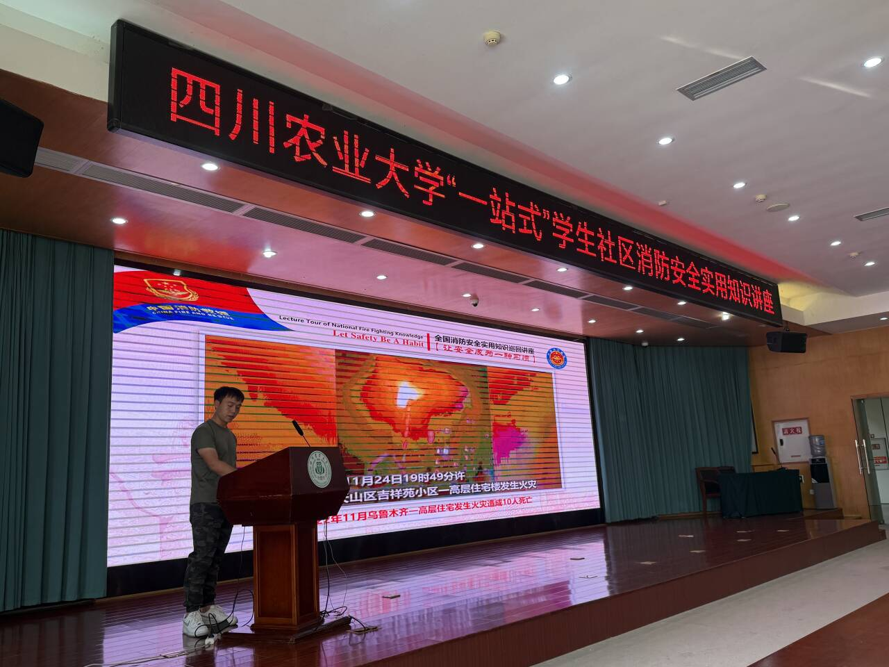 10月15日上午9时,四川农业大学“一站式”学生社区在雅安校区十教一楼报告厅成功举办了一场以“消防安全实用知识”为主题的专题讲座。中央广播电视总台编导,原天津港灭火救援英雄中队消防员、年度公共人物张梦凡受邀担任主讲,来自各学院的师生代表、央视导演组及校园安全员等210余人齐聚一堂,共同聆听这场关乎生命安全的“必修课”。