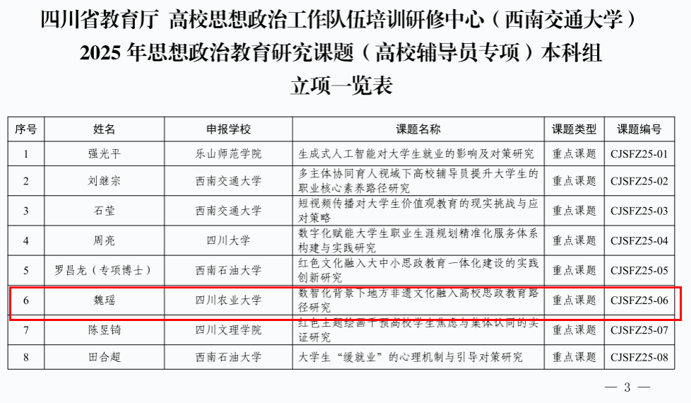 11月18日,四川省教育厅公布了2025年思想政治教育研究课题(高校辅导员专项)立项情况,我校1项目获本科组重点课题立项。