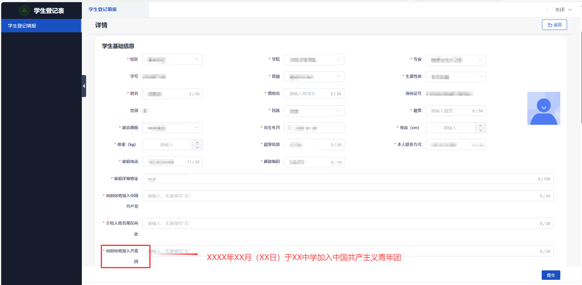 (二)请各学院、班主任提醒各位同学认真填写,仔细核实相关信息,避免因漏填错填对学生毕业后政治审查等关系个人发展的事宜产生影响。
