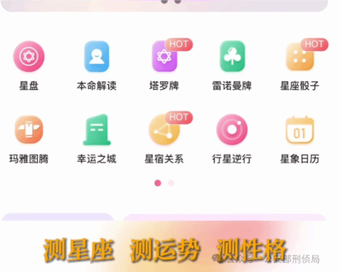 “测星座”“测性格”“测运势”等各类测试,往往需要填写个人的姓名、手机号、身份证号,一旦填写以上个人信息,你的性格喜好、家庭条件等情况就会被骗子收集分析,从而量身定制诈骗方案,实施精准诈骗。