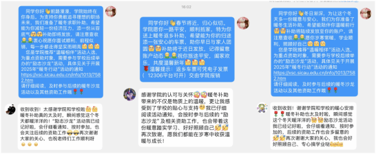 精准资助惠学生,传递学院关怀。根据学生受助情况、现实需求,综合家庭实际情况,将“暖冬资助”分为生活补助、求职支持和返乡交通补贴三类,共资助26位家庭经济困难学生,发放资金共计14600元。并推荐了15名重点资助对象进入学校层面的评选与资助流程,确保“暖冬行动”既有温度又有力度。