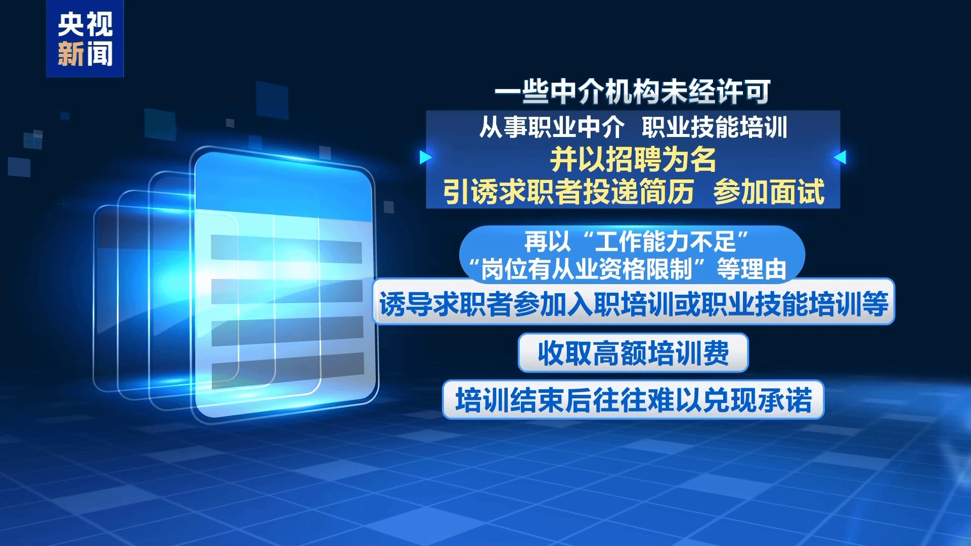 从事职业中介、职业技能培训,应当取得人力资源和社会保障部门行政许可。但一些中介机构未经许可,从事职业中介、职业技能培训,并以招聘为名,引诱求职者投递简历、参加面试,之后再以“工作能力不足”“岗位有从业资格限制”等理由,诱导求职者参加入职培训或职业技能培训等,收取高额培训费,培训结束后往往难以兑现承诺。