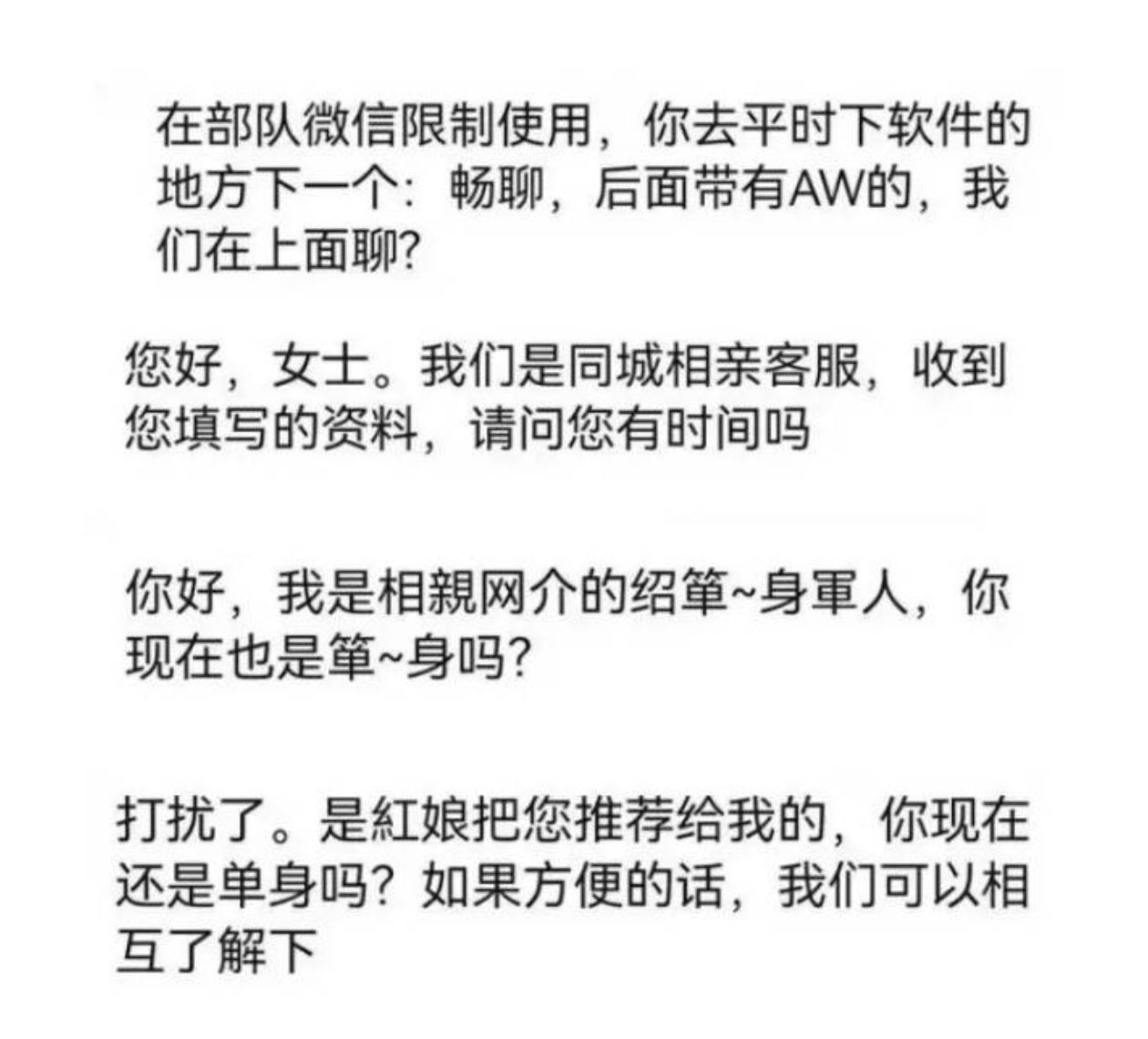 骗子发送自称通过他人介绍、某APP 好友等带有相亲意向的短信,或冒充提供相亲服务,诱导用户添加其联系方式、回拨电话、下载APP等进行引流,实施诈骗。