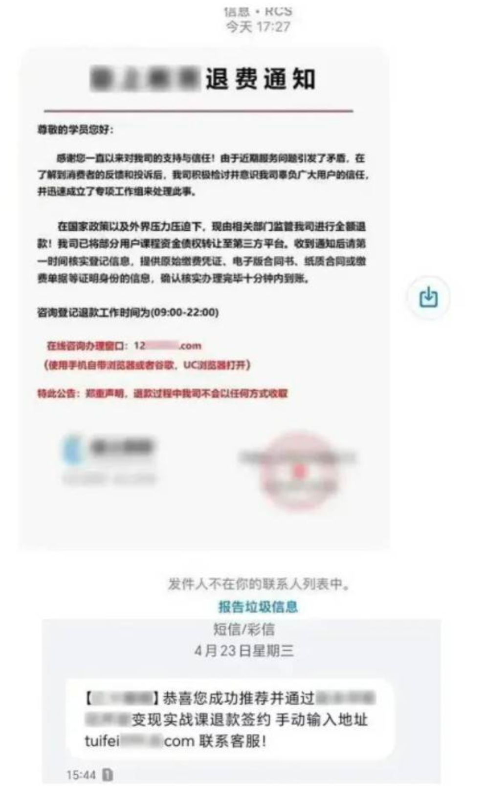 六、各类退费诈骗短信