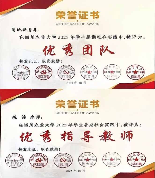 近期,四川农业大学“蜀地新青年”社会实践团队在2025年暑期社会实践活动评选中脱颖而出,荣获校级“优秀团队”称号,指导教师陈浠获评“优秀指导教师”称号。